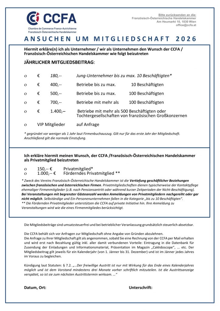 Die CCFA stützt sich auf ihr Netzwerk und auf Sie als Mitglied. Durch Ihre Mitgliedschaft unterstützen Sie das Ziel der CCFA, die Entwicklung der Geschäftsbeziehungen zwischen Frankreich und Österreich zu intensivieren.